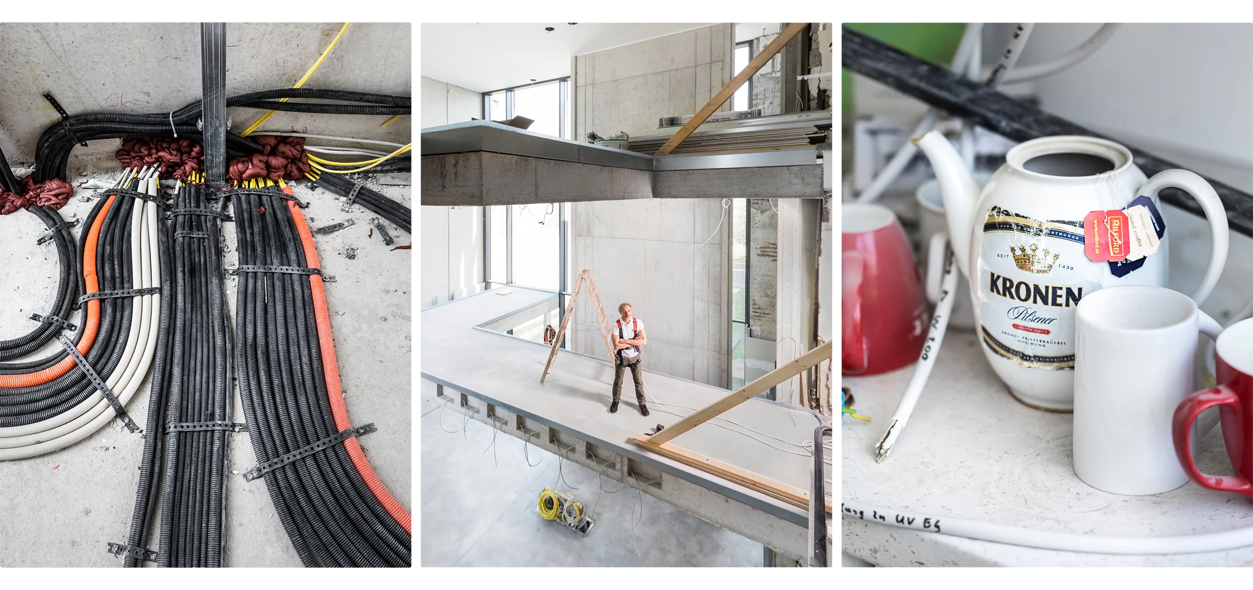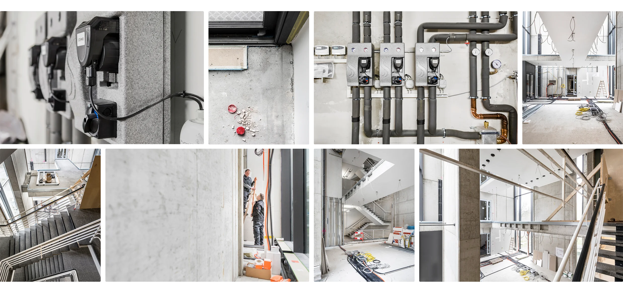 Unverputzt // Das Gebäude des Leibniz-Instituts für Analytische Wissenschaften wurde durch einen modernen Anbau ergänzt. Die Fotografien zeigen Mitarbeitende im Rohbau, umgeben von einem Geflecht aus Kabeln, Rohren und Betonstrukturen, welche die Komplexität der Thematik widerspiegelt.