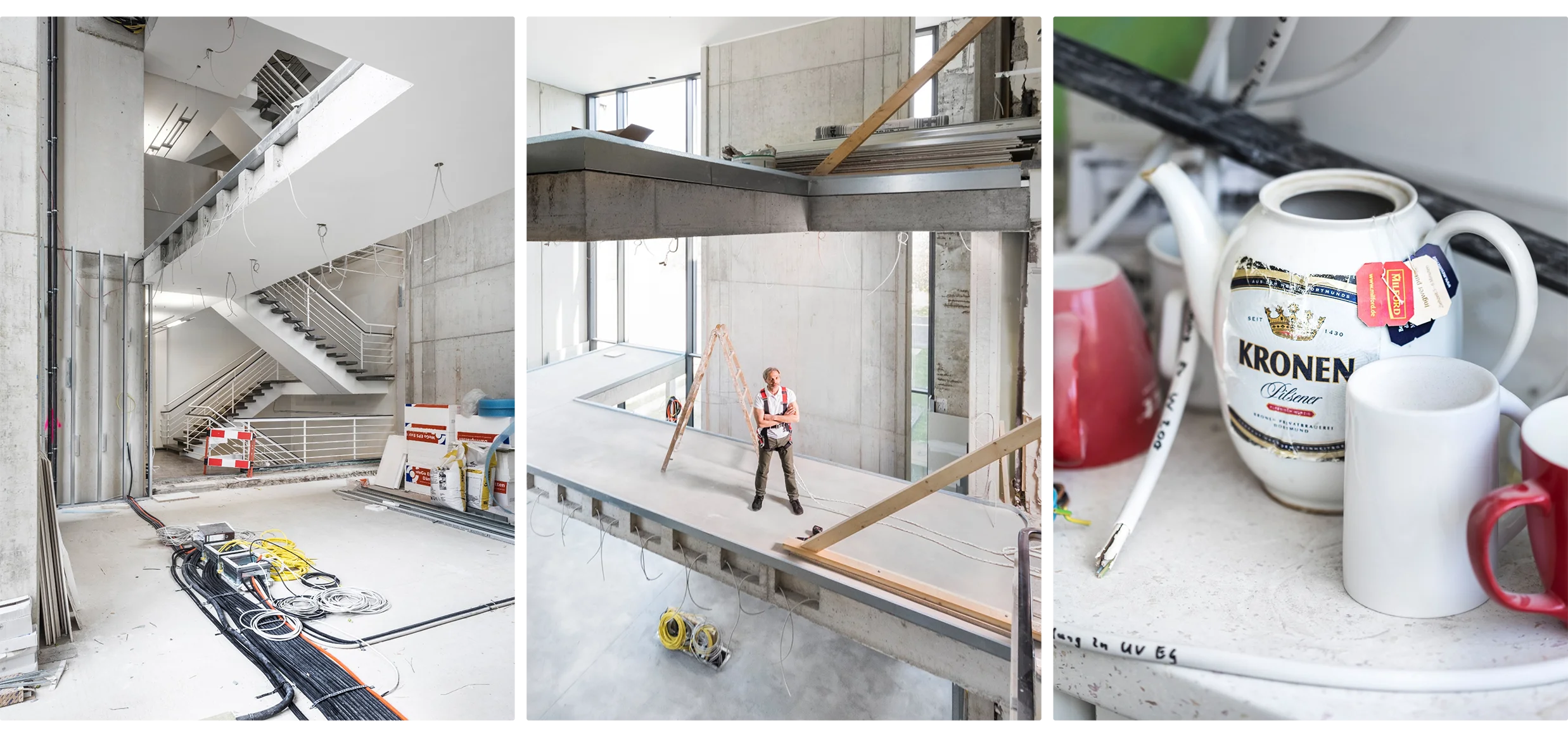 Die Aufnahmen zeigen Arbeitsporträts mitten im Baustellenbetrieb. Umgeben von Kabeln, Rohren und Betonstrukturen geben sie Einblick in die komplexen Abläufe eines Rohbaus. Dem gegenüber steht das neue Gebäude mit klaren Perspektiven, aufgeräumten Strukturen und Fotografien des Teams vor Ort.