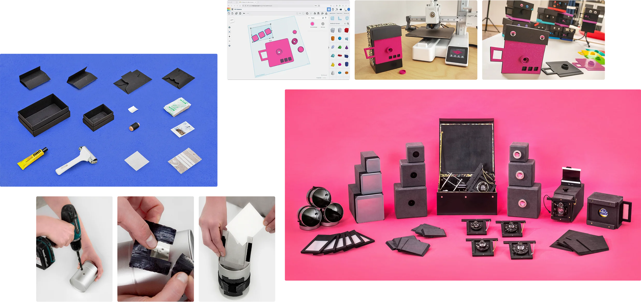 DIY Kamerabau // In den Workshops werden analoge Kameras entworfen und gebaut – aus einfachen Blechdosen, aus Holzplatten oder digital per 3D-Druck. Alles ist möglich, und alles daran bereitet Freude. Die Arbeit mit der analogen Technik öffnet den Blick auf das Medium Fotografie und zeigt, wie Bilder entstehen.